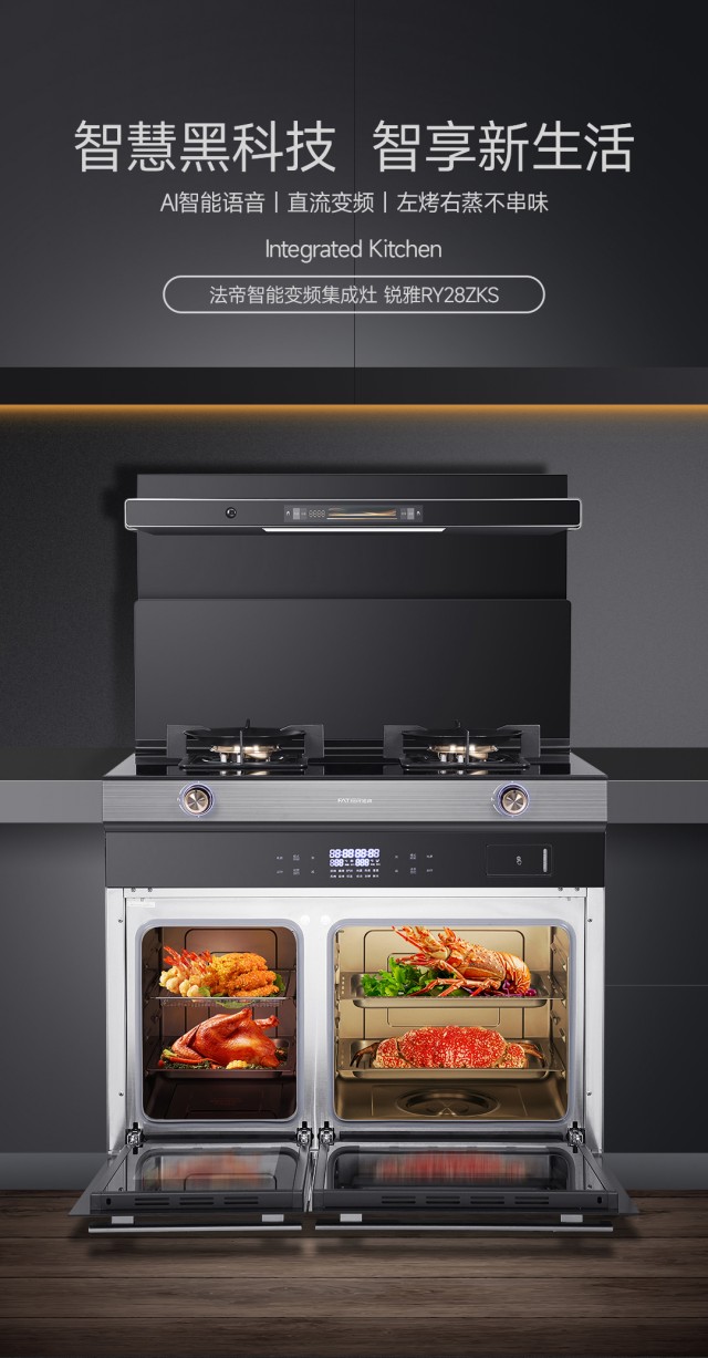 法帝銳雅RY28ZKS蒸烤炸集成灶,集成蒸、烤、炸三種烹飪功能,高溫鎖鮮、均勻烤制、健康空氣炸滿足對于美食的所有需求,讓每一口美食都盡在自己的掌握中,美味更健康!
