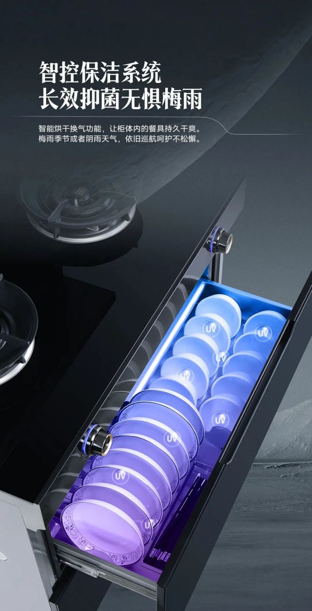 法帝新款X5保潔柜款集成灶采用紫外線+臭氧雙重殺菌技術,360°立體除菌,有效防止細菌滋生。并且還搭載獨立烘干功能,可以保持保潔柜內的長期清新舒適,餐具無異味,避免潮濕滋生細菌,容量大用起來更省心,妥妥滿足5-8口之家的使用需求,為您和家人的健康保駕護航。