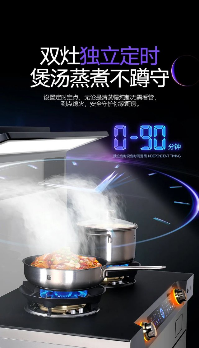 法帝星耀XL15ZK集成灶還搭載了雙灶獨立定時功能,按照烹飪食材設定其所需的烹飪時間,時間一到自動熄火,無需看管,安心定制屬于你的專屬美味。
