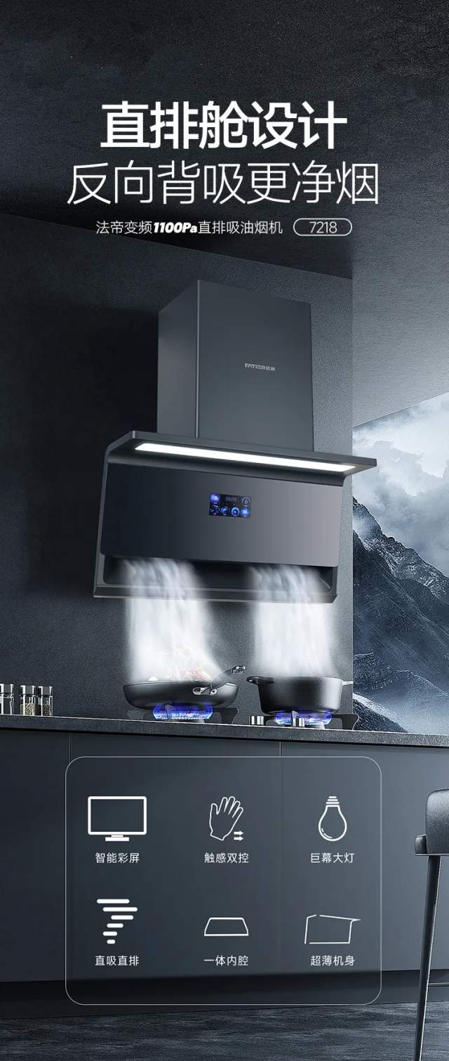 法帝7218超薄變頻油煙機,通過科學合理的設計,保持廚房的清爽,不再讓人畏懼一日三餐的烹飪。